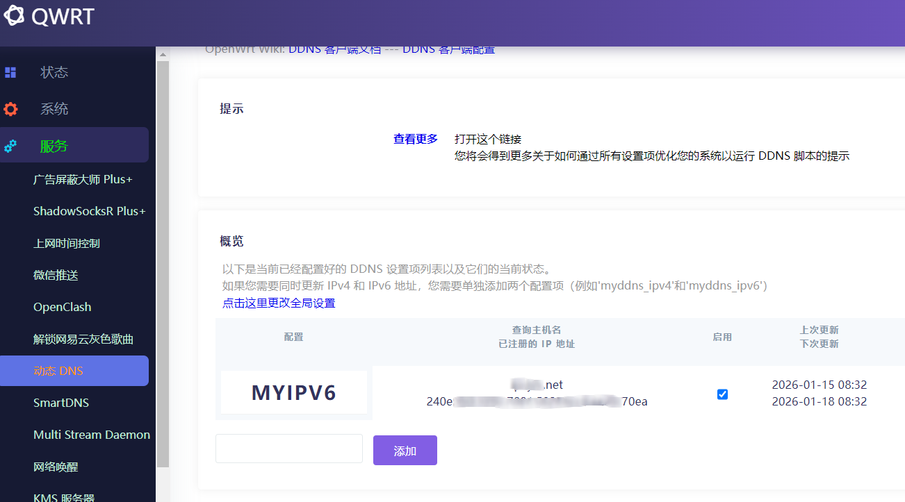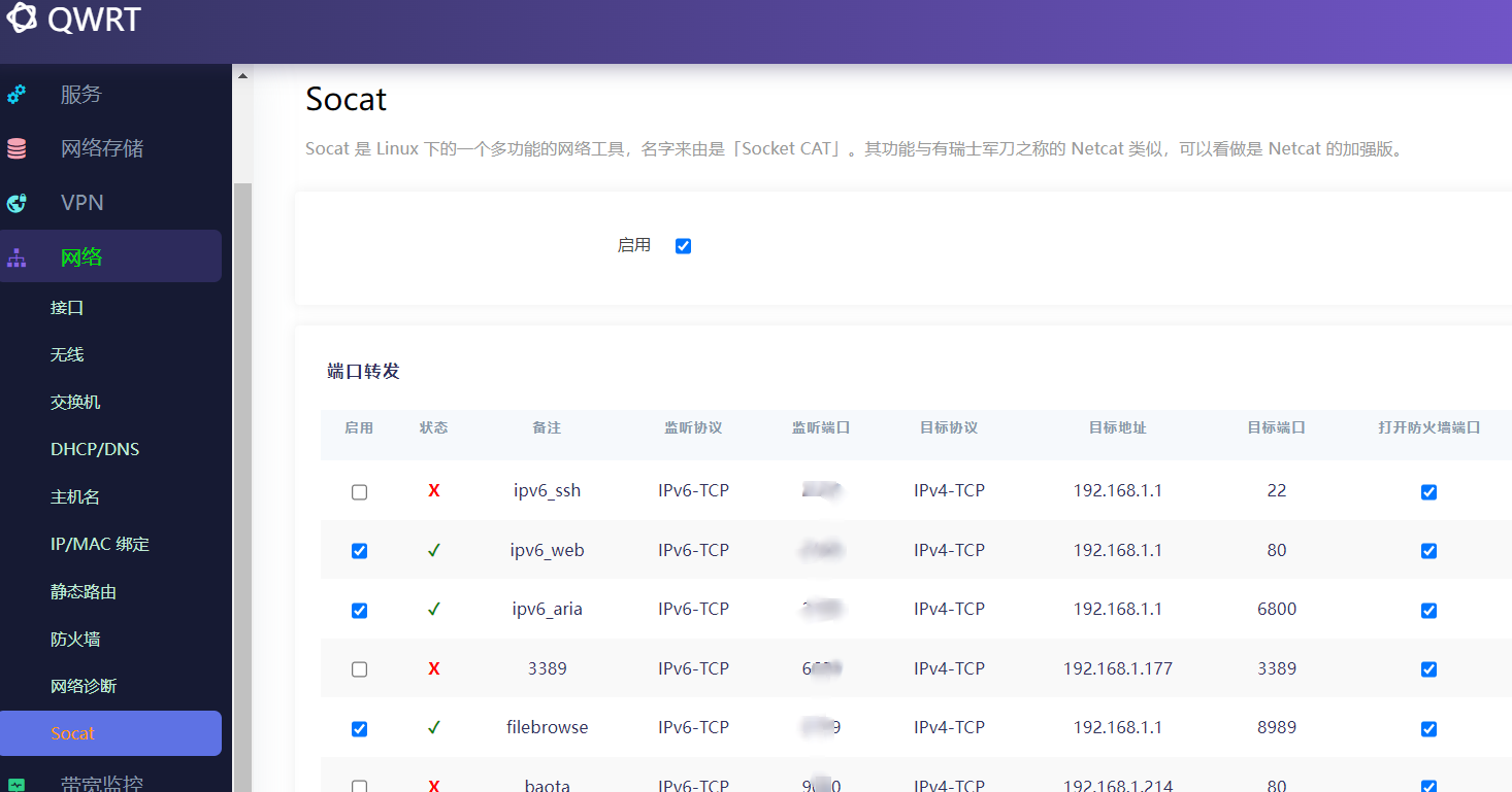 然后要是运营商封闭80端口或有些路由器应用不支持ipv6,可用网络页面中的socat进行映射,将ipv6地址映射到ipv4地址
